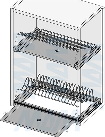 Комплектация: посудосушитель для чашек, посудосушитель для тарелок, поддон, крепёж