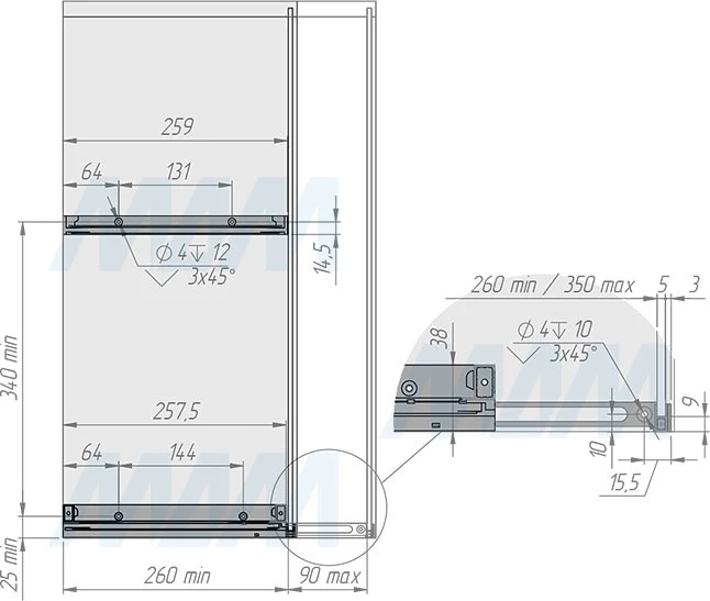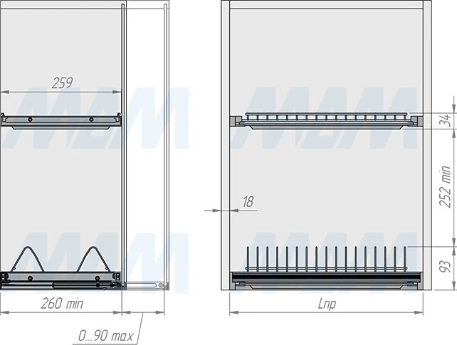 Примечание: в случае установки посудосушителя по передней плоскости корпуса максимальный диаметр тарелки — 260 мм
